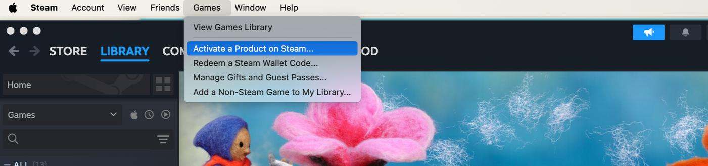 - Clicking the Games menu option at the top of the Steam app (uppermost toolbar on your computer screen, see below).